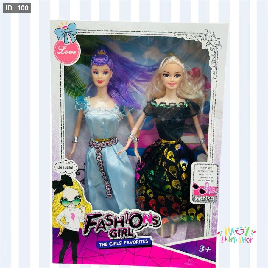 • دمية بشعر بنفسجي طويل ترتدي فستانًا أزرق فاتح مع إكسسوارات فضية