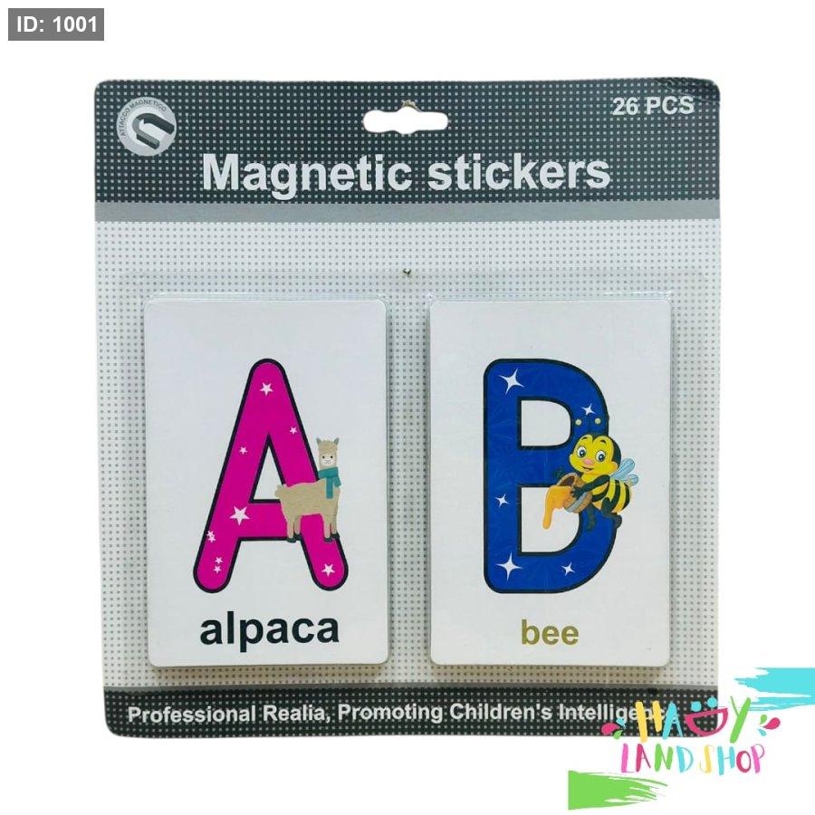 مجموعة الملصقات المغناطيسية التعليمية للأطفال تحتوي على 26 قطعة تمثل حروف الأبجدية الإنجليزية، كل حرف مصمم بلون جذاب ومرفق بصورة توضيحية لكائن أو عنصر يبدأ بذلك الحرف، مثل "A" مع صورة ألباكا و"B" مع نحلة.