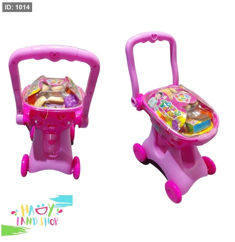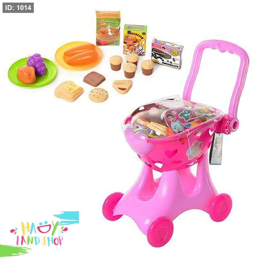 عربة تسوق للأطفال مع مجموعة ألعاب غذائية تعليمية، مصممة لتعزيز اللعب التخيلي وتنمية مهارات الطفل.