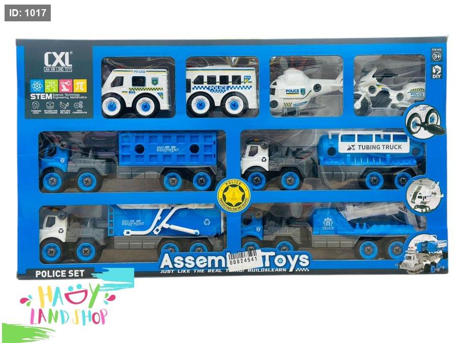 • تتضمن حافلة شرطة، سيارة فان، مروحيتين، شاحنات معدات ثقيلة وأنابيب، جميعها بتصميم واقعي باللونين الأزرق والأبيض.