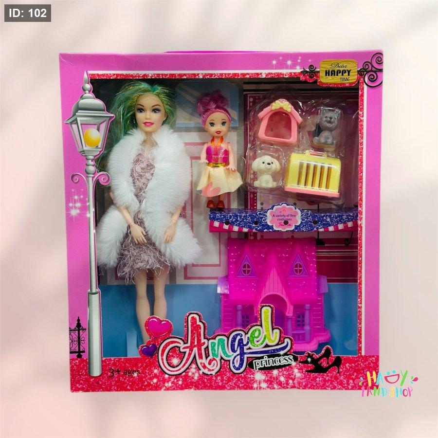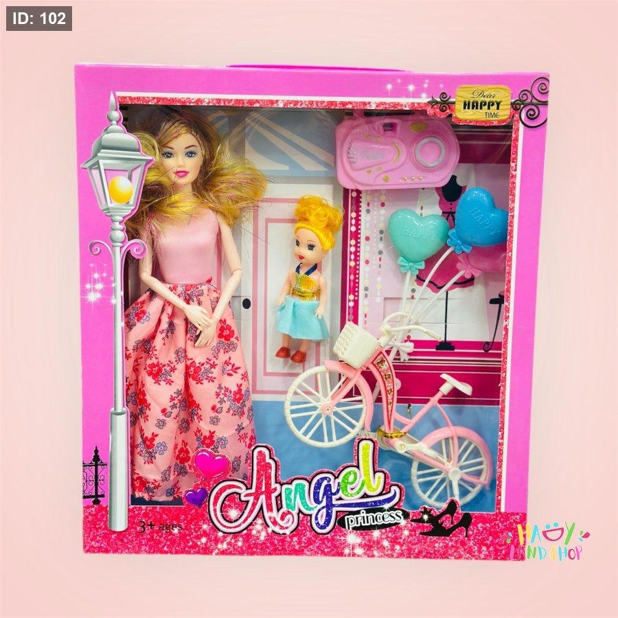 - دمية أميرة ترتدي بلوزة وردية وتنورة طويلة مزينة بالزهور