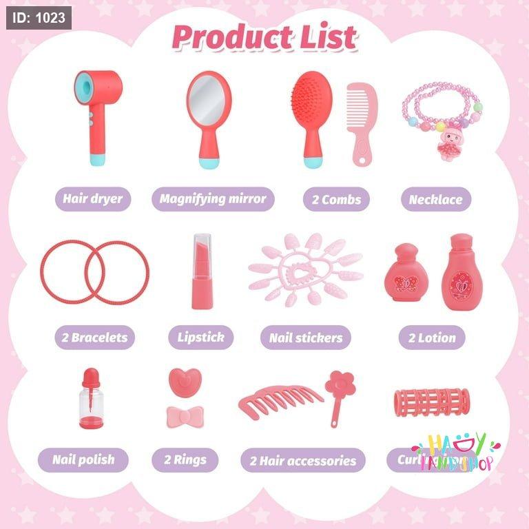 • يشمل فرشاة شعر، مشط، مجفف شعر، عطر، أحمر شفاه، ومجوهرات