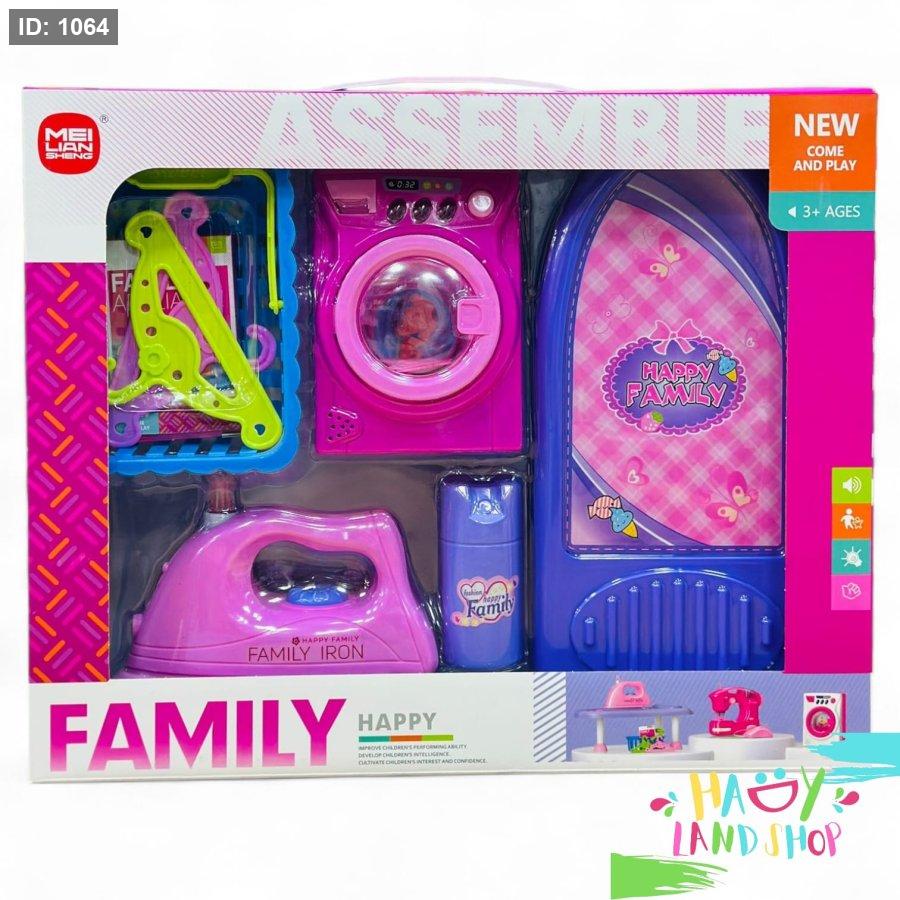 تتضمن أدوات منزلية مصغرة مثل غسالة، طاولة كي، مكواة، بخاخ، وسلة غسيل مع علاقات، بألوان زاهية بالوردي والبنفسجي مع لمسات خضراء.