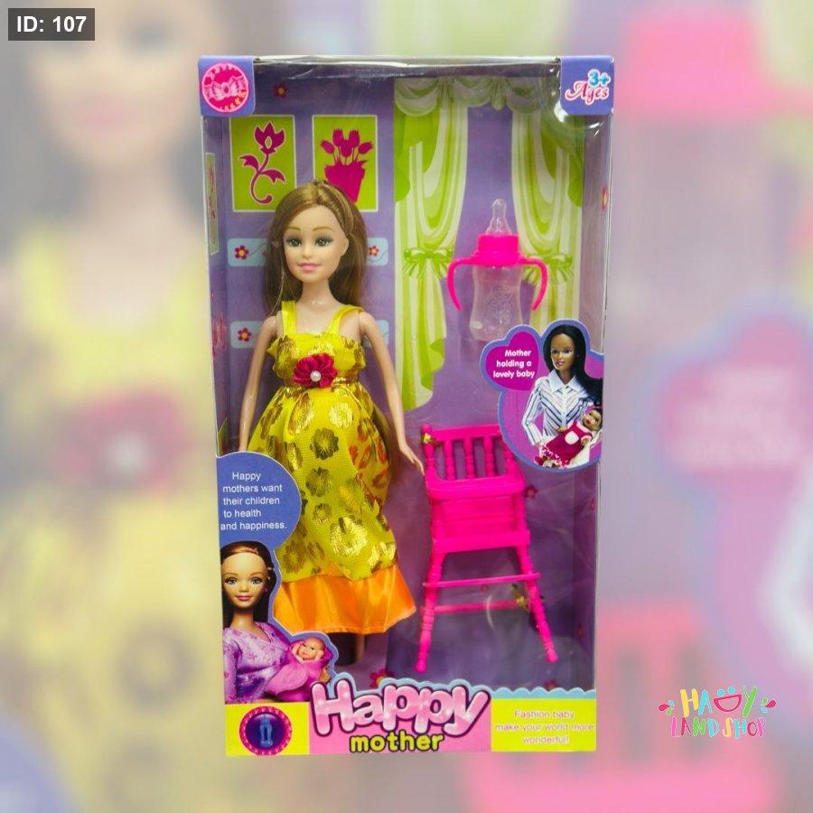 دمية ترتدي فستانًا أصفر مزينًا بنقوش زهرية ووردة وردية