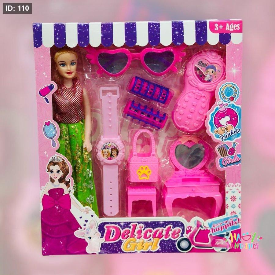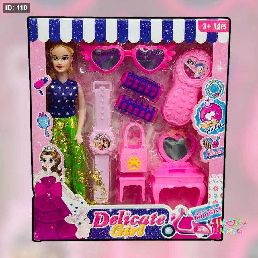 • فرشاة شعر، مرآة، حقيبة يد، كرسي صغير، وبكرات شعر بنفسجية