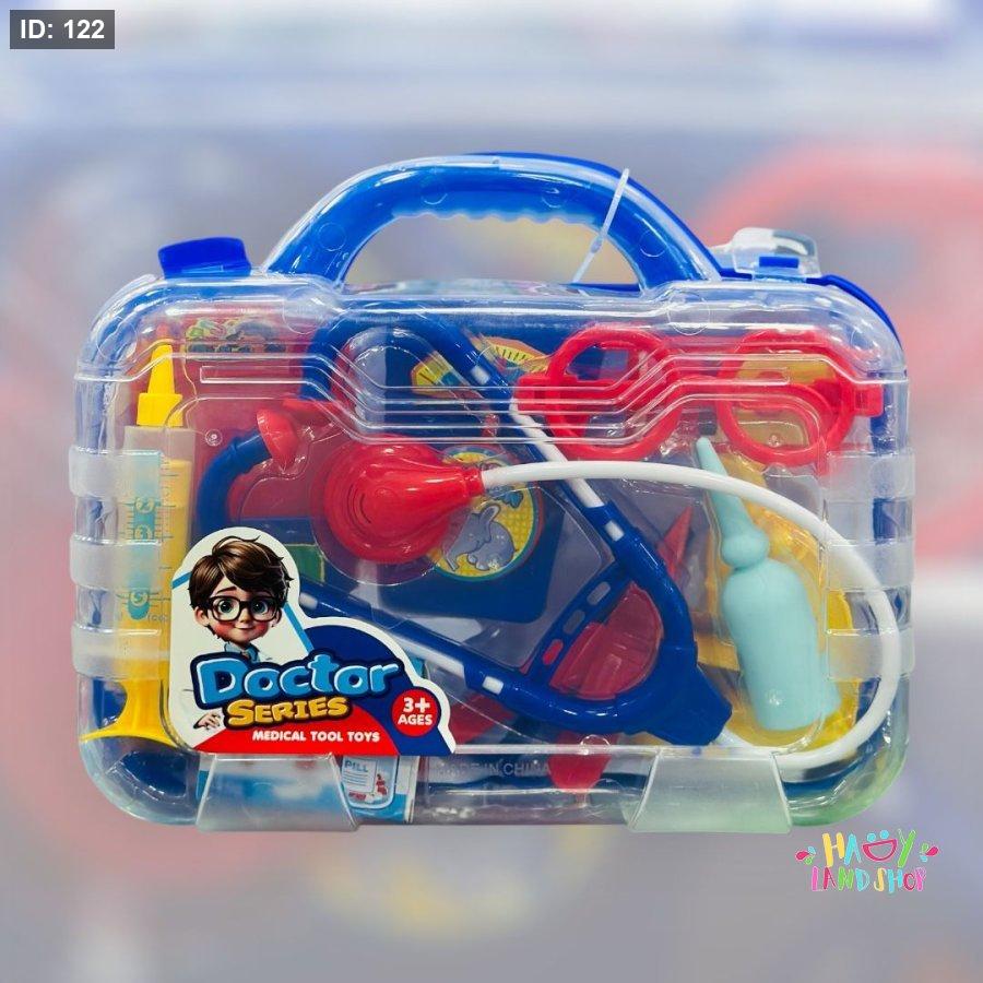 حقيبة طبية شفافة تحتوي على مجموعة أدوات فحص ملونة، مصممة لتشجيع الأطفال على استكشاف عالم الطب والرعاية الصحية بطريقة ممتعة وتعليمية.