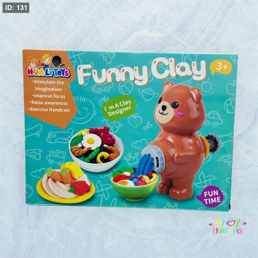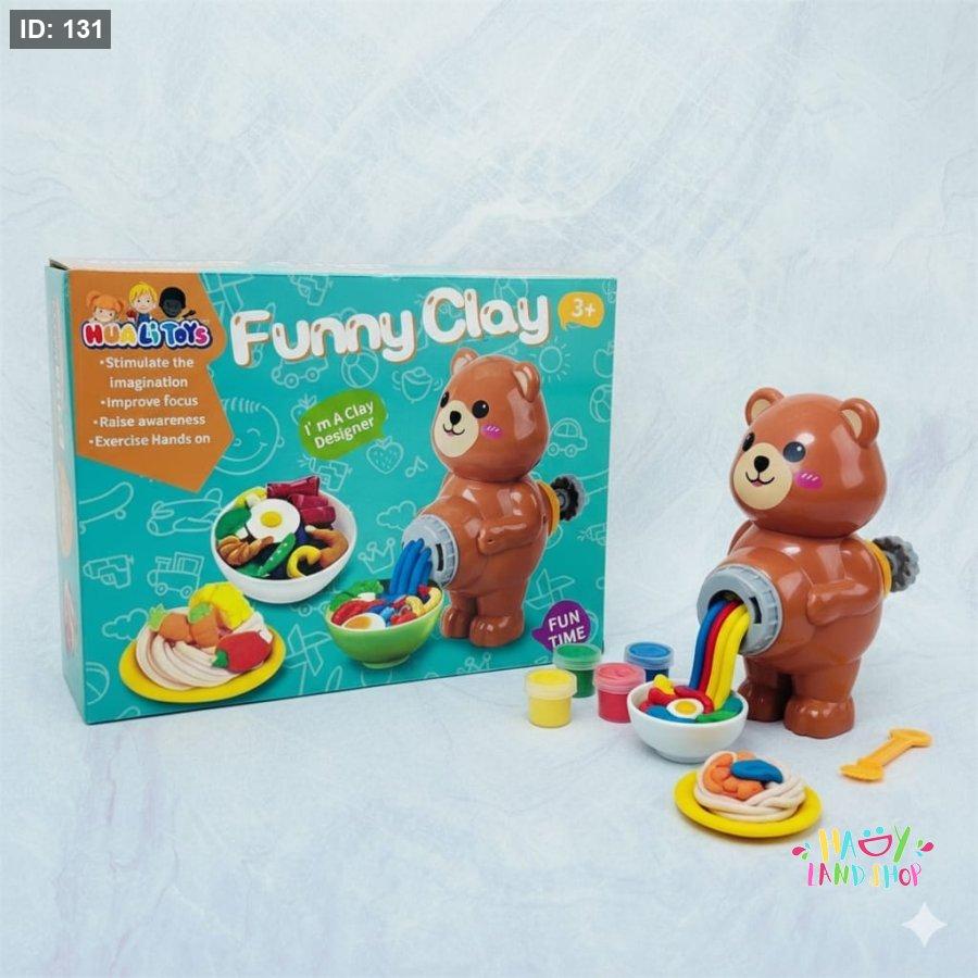مجموعة تشكيل ممتعة للأطفال تحتوي على دمية على شكل دب لطيف تعمل كآلة ضغط للعجينة، مصممة لتشجيع الأطفال على التعبير الفني وصنع أشكال طعام ملونة باستخدام عجينة اللعب.
