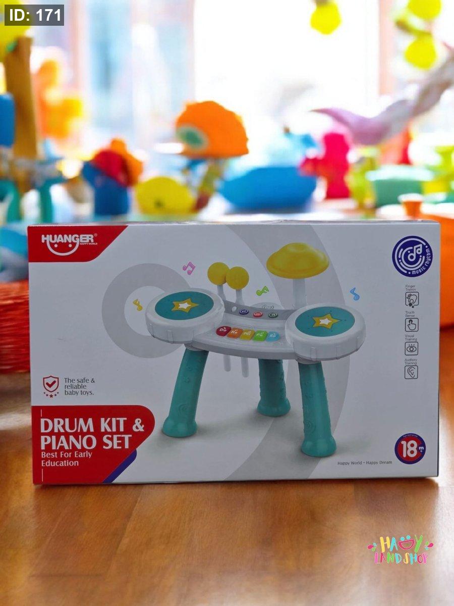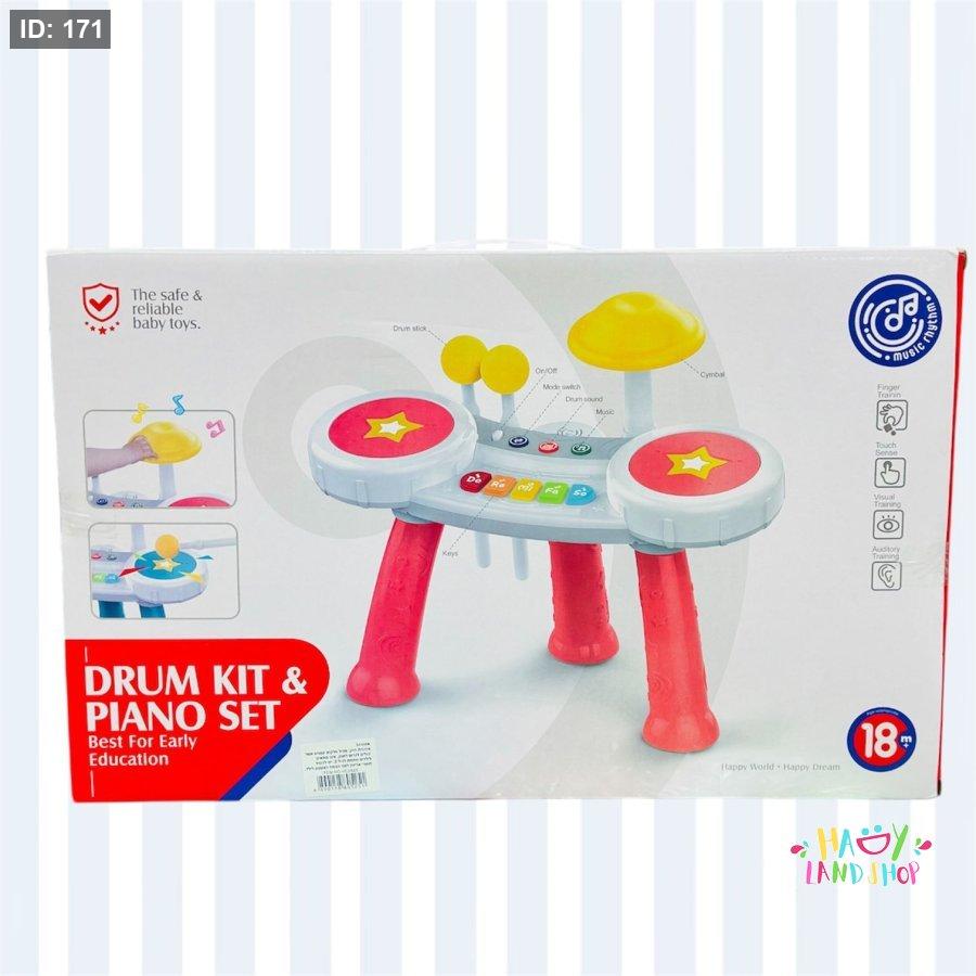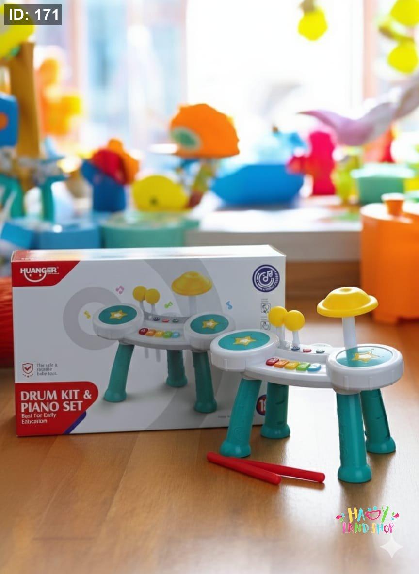 الوصف: مجموعة موسيقية متكاملة تحتوي على طبول وبيانو، مصممة لتشجيع الأطفال على التفاعل الصوتي وتطوير مهاراتهم الحركية والموسيقية