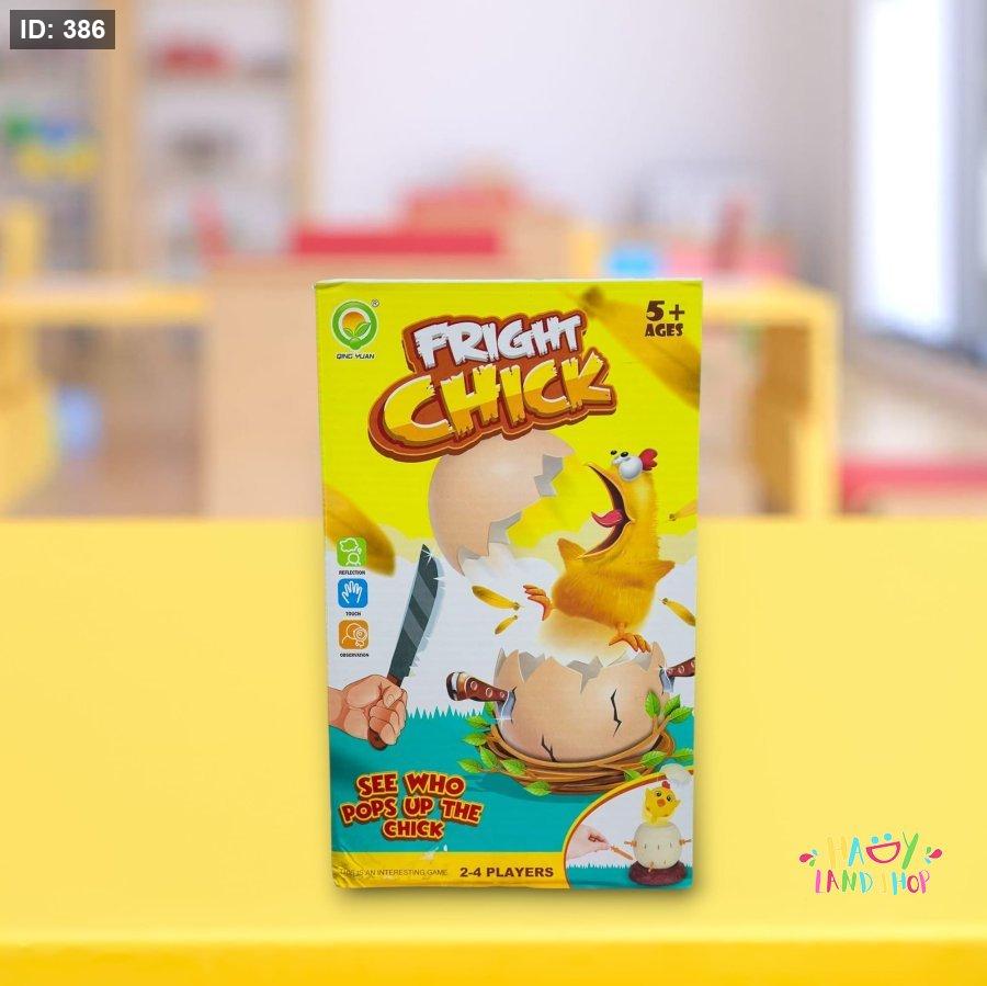 "Fright Chick" هي لعبة جماعية للأطفال من عمر 5 سنوات فما فوق، حيث يتناوب اللاعبون على الضغط حتى... يفقس الكتكوت فجأة! من سيكون صاحب الحظ (أو الصدمة)؟