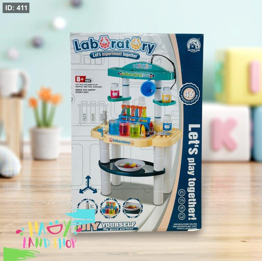 * **مختبر متكامل:** طاولة تجارب مجهزة بالكامل مع أنابيب اختبار، كؤوس، قوارير، ومواد آمنة لخلط الألوان وإجراء تجارب مدهشة. 🧪