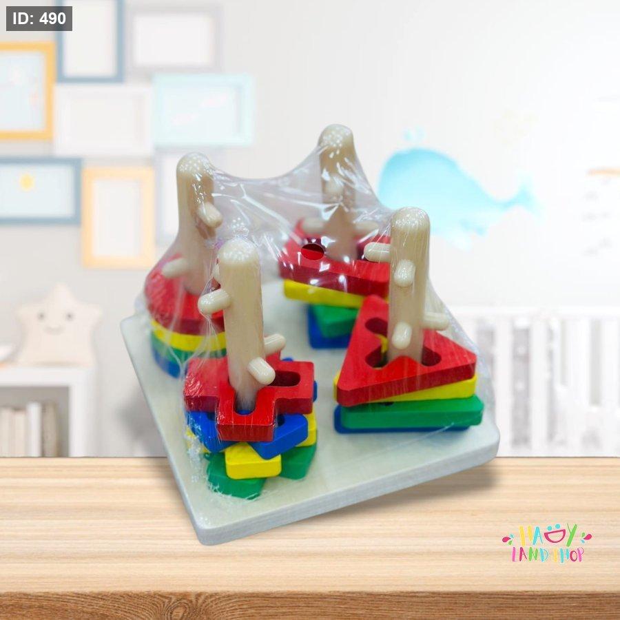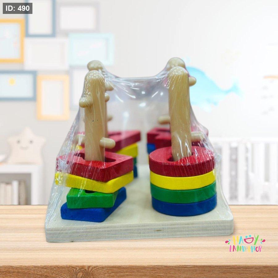 امنح طفلك تجربة تعليمية ممتعة مع هذه اللعبة الخشبية الرائعة! تحتوي على قاعدة متينة مزودة بأوتاد عمودية، تُركّب عليها أشكال هندسية ملونة (دوائر، مربعات، مثلثات) بألوان زاهية: الأحمر، الأزرق، الأخضر، والأصفر. كل شكل مصمم بدقة ليتناسب مع الأوتاد، مما يساعد الطفل على تطوير مهارات التنسيق بين اليد والعين، والتعرف على الأشكال والألوان بطريقة تفاعلية.