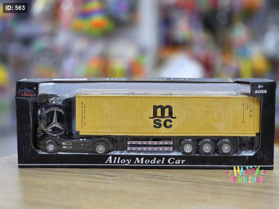 تصميم واقعي مستوحى من شاحنات الشحن العالمية، بلون أسود أنيق وحاوية صفراء تحمل شعار "MSC – Mediterranean Shipping Company".