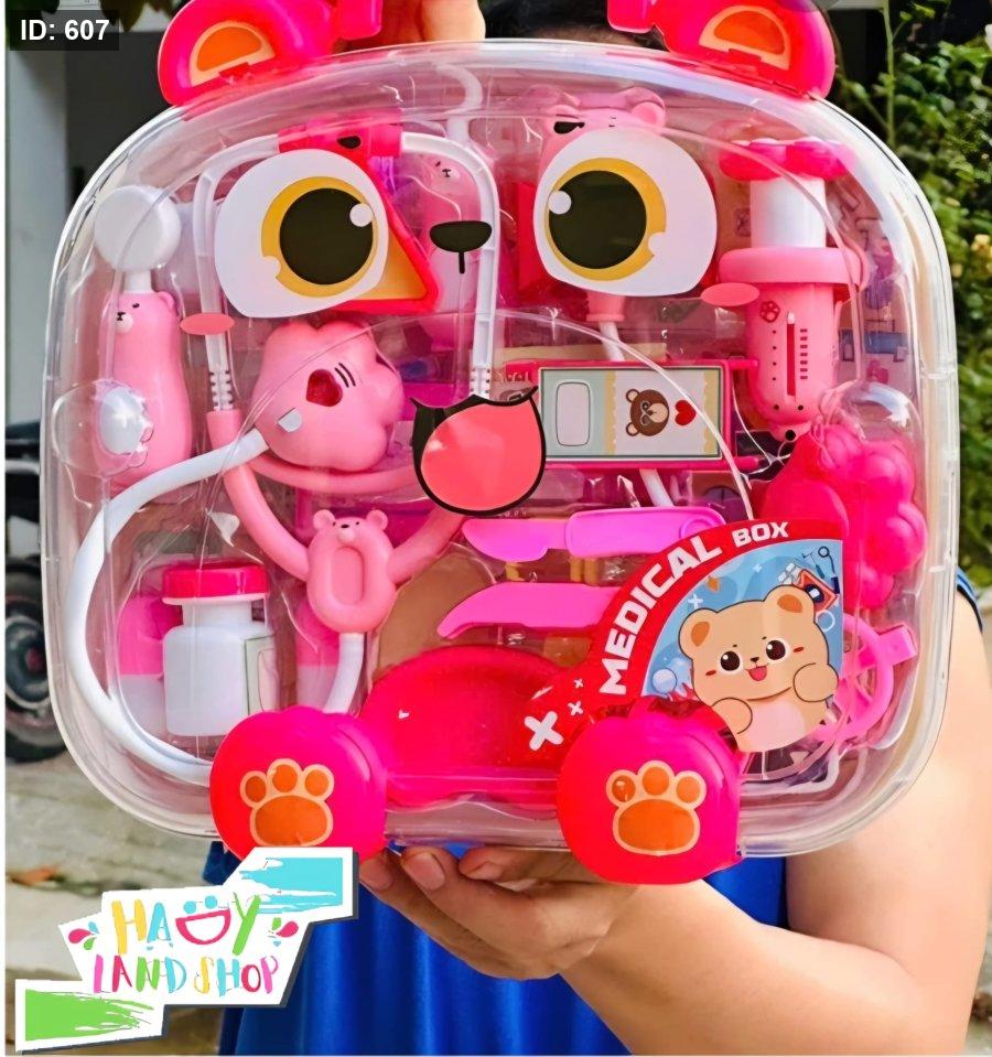امنح طفلك تجربة لعب مليئة بالحب والخيال مع صندوق الطبيب الصغير المصمم على شكل وجه دب وردي لطيف! هذا الطقم الطبي الشفاف يحتوي على مجموعة أدوات طبية آمنة وممتعة، تساعد الأطفال على التعرف على عالم الطب والرعاية الصحية بطريقة مرحة ومشوقة.
