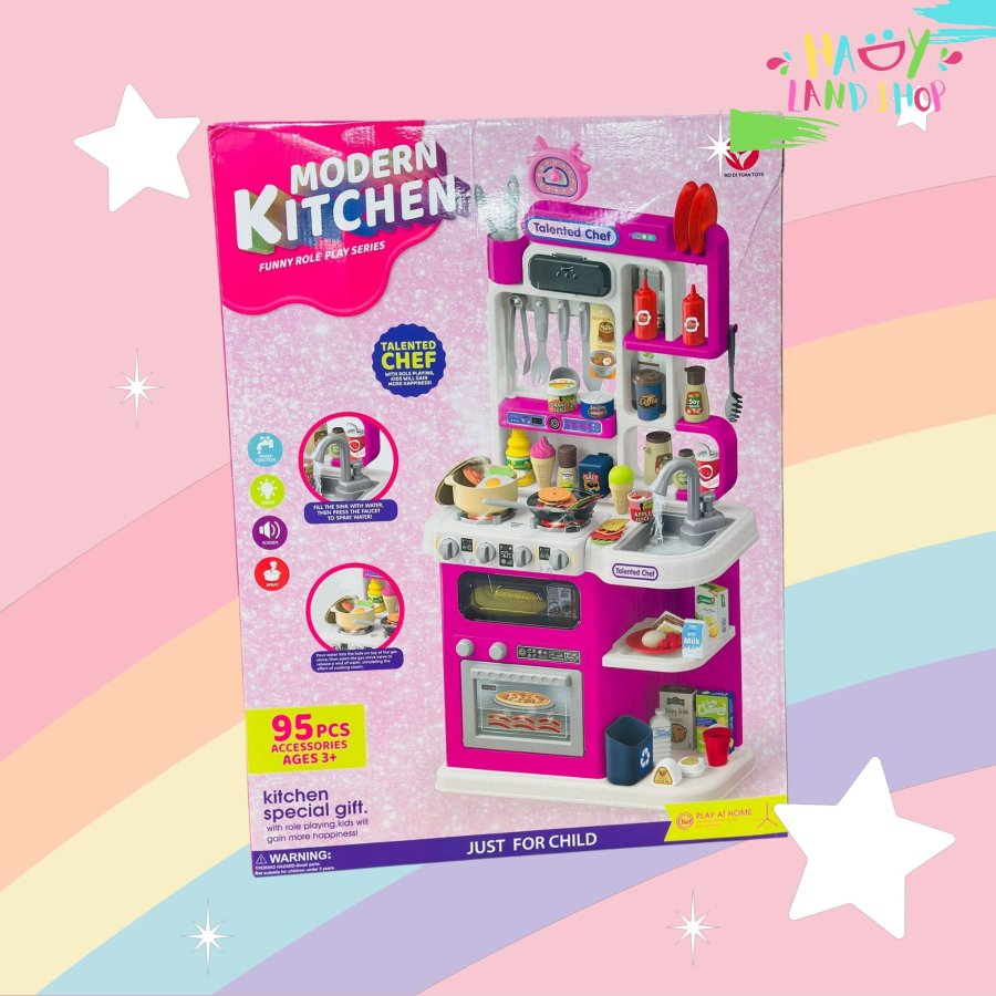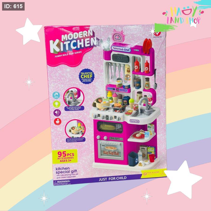 تصميم أنيق بألوان وردية وبنفسجية جذابة، يحتوي على موقد، فرن، مغسلة، أواني، توابل، وأدوات مطبخ متنوعة، بالإضافة إلى مؤثرات الصوت والضوء التي تضيف لمسة واقعية مذهلة.