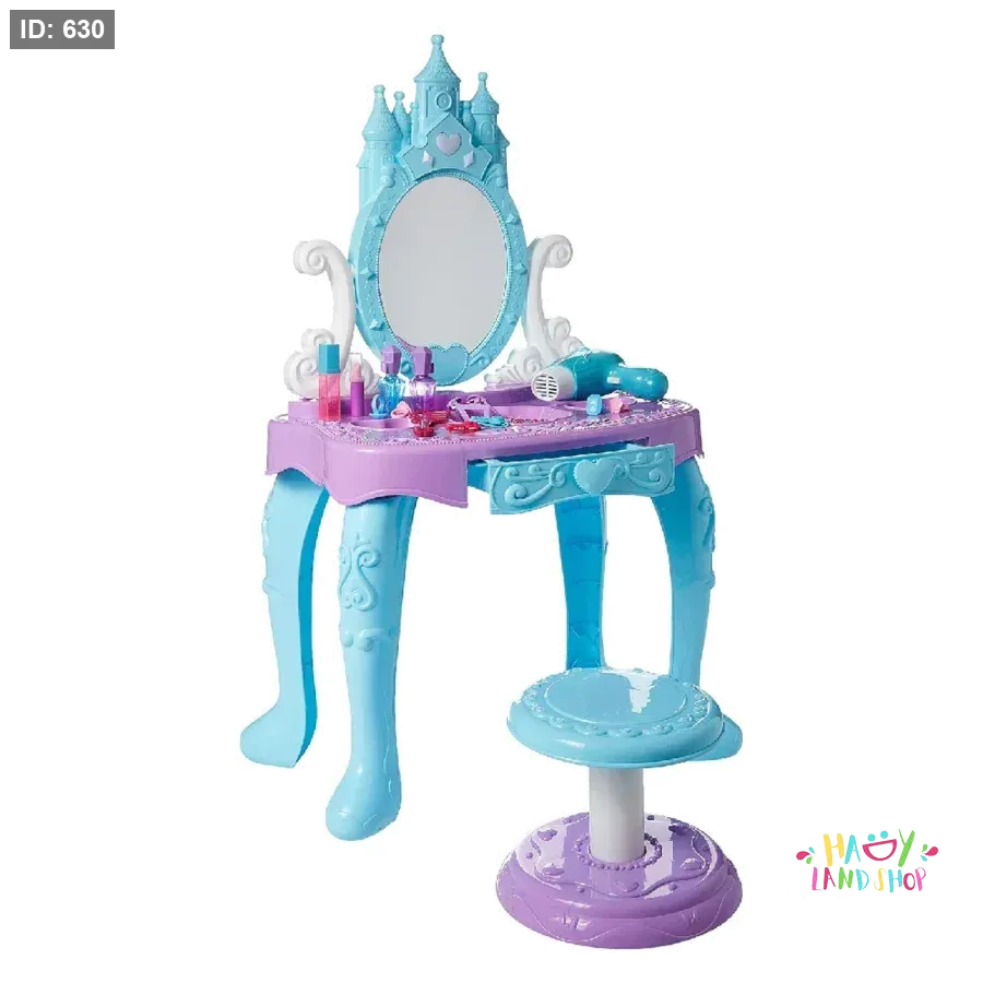💍 مجموعة إكسسوارات كاملة: تأتي الطاولة مع مجموعة متنوعة من إكسسوارات التجميل المقلدة الضرورية لإكمال إطلالة الأميرة، مثل الفرشاة، الأساور، والزجاجات.