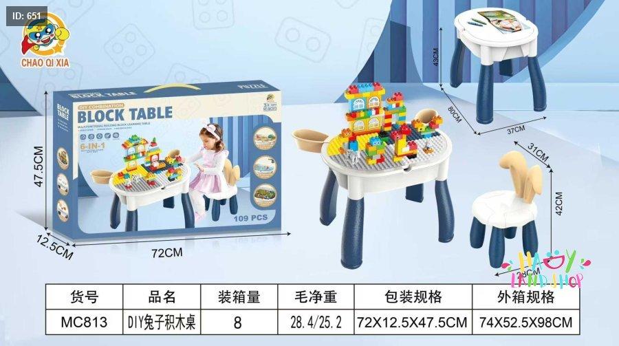 اكتشف الهدية المثالية التي تجمع بين المرح والتعليم! طاولة متعددة الوظائف تمكن طفلك من البناء، الرسم، والتعلم، تأتي مع طقم مكعبات كامل وكرسي بتصميم "الأرنب" المحبب للأطفال.