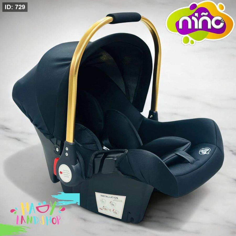 كرسي سيارة للأطفال حديثي الولادة من ماركة niño، تصميم أنيق باللون الأسود مع مقبض ذهبي فاخر.