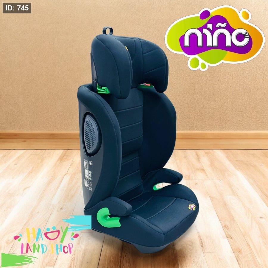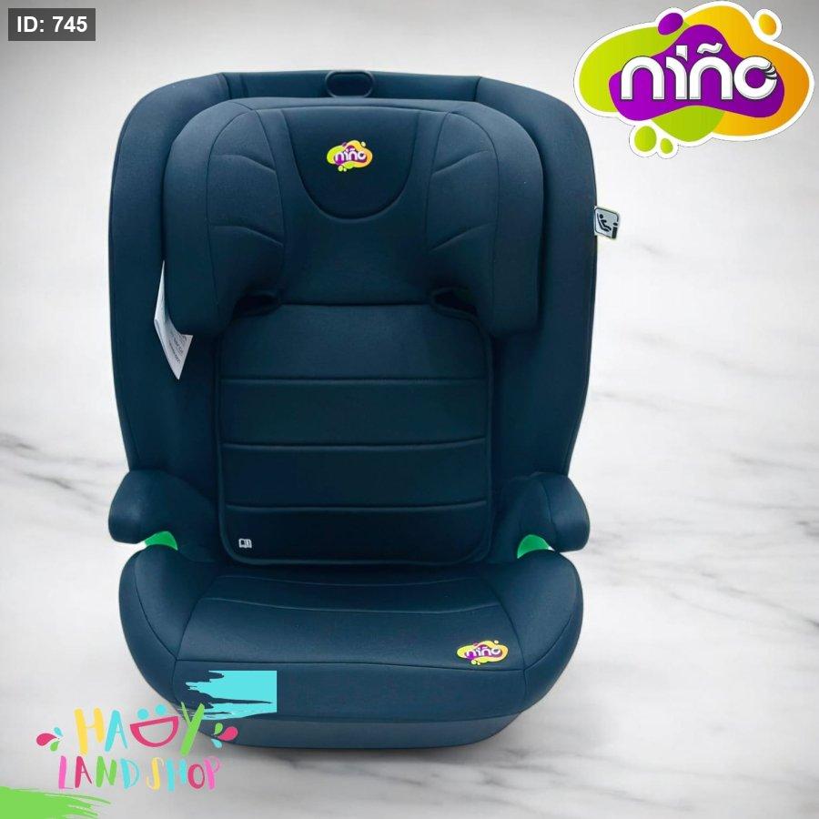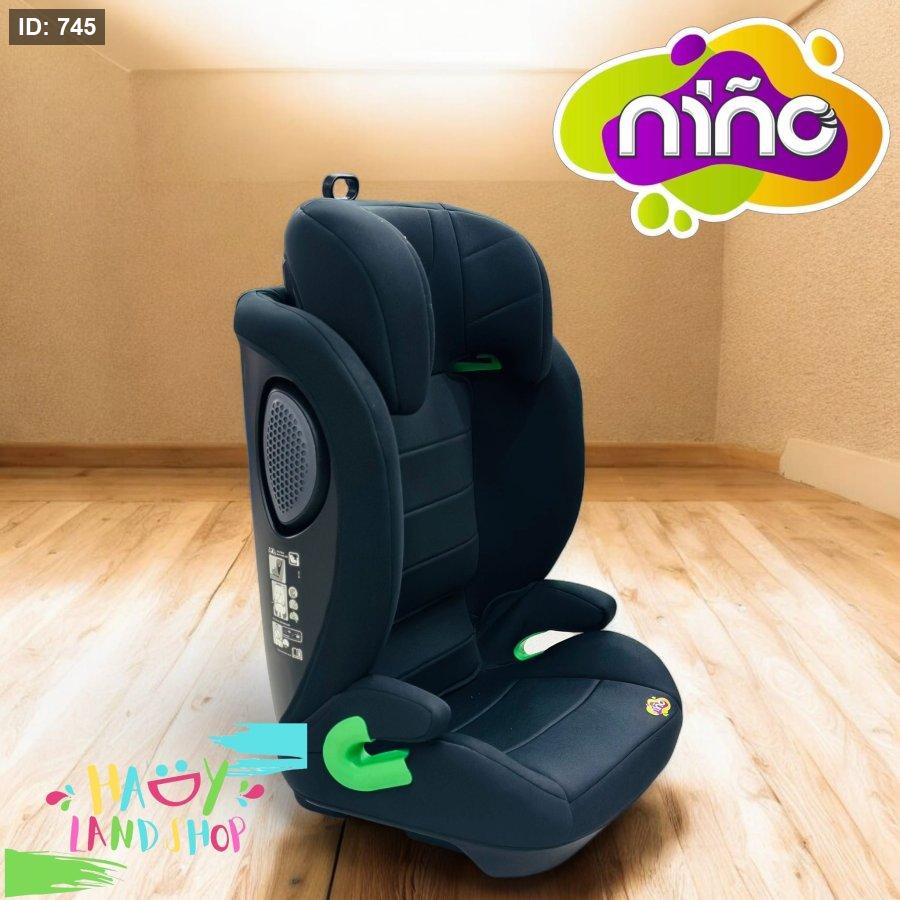 كرسي سيارة للأطفال بتصميم عصري من ماركة NINO، بلون أسود داكن مع لمسات خضراء أنيقة. يتميز بجوانب مبطنة لحماية الرأس وتوفير أقصى درجات الراحة أثناء التنقل،