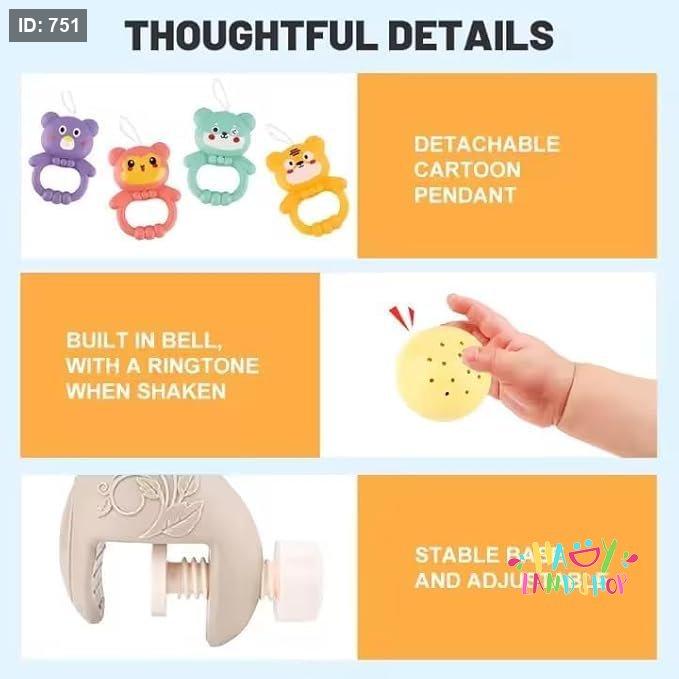 يتدلى من الذراع البلاستيكي المزخرف خمسة عناصر ملونة: أربع دمى حيوانات (دب أخضر، نمر برتقالي، دب أحمر، كوالا بنفسجي) وكرة صفراء، مما يجذب انتباه الطفل ويحفّز تطوره البصري والسمعي.