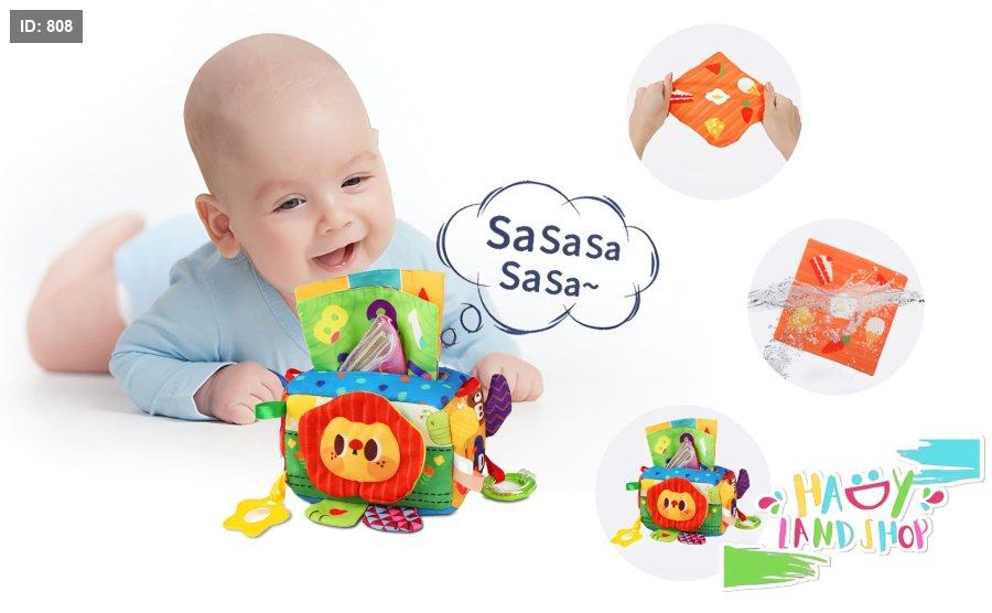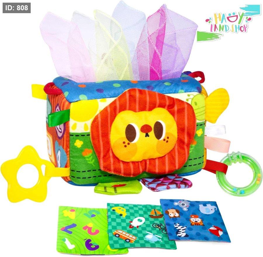 يأتي بتصميم ناعم يشبه صندوق المناديل، مزين بوجوه حيوانات لطيفة مثل الأسد والفيل، ويحتوي على شرائط قماشية ملونة قابلة للسحب، مما يمنح الطفل تجربة حسّية ممتعة.