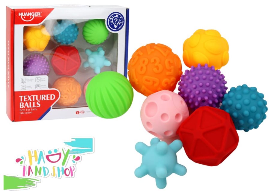 مجموعة الكرات الحسّية من HUANGER تحتوي على 8 كرات ملونة بأشكال وملمس متنوع، مصممة خصيصًا لتحفيز الحواس وتنمية المهارات الحركية الدقيقة للأطفال من عمر 18 شهرًا فما فوق.
