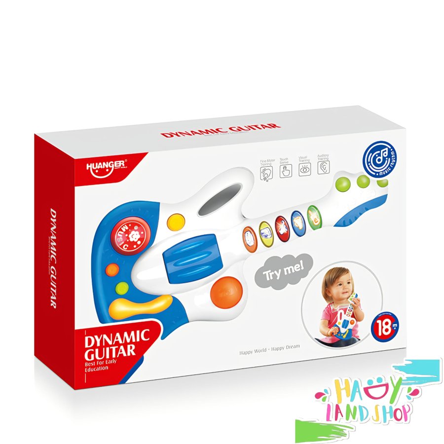 جيتار HUANGER الديناميكي هو لعبة موسيقية تفاعلية مصممة للأطفال من عمر 18 شهرًا فما فوق، تجمع بين المرح والتعلم من خلال الأزرار الملونة والمؤثرات الصوتية.