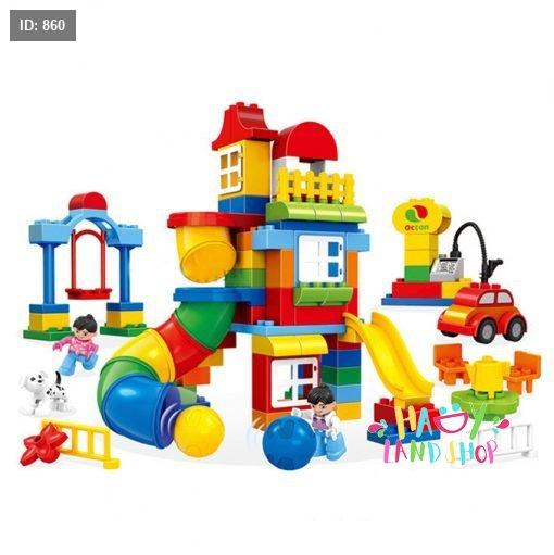 المحتوى: 160 قطعة متنوعة تشمل مكعبات بألوان زاهية، أرقام من 0 إلى 9، رموز رياضية (+، -، ×، ÷)، أشكال فواكه، شخصيات، سيارة، زحليقة، أشجار، وزهور.