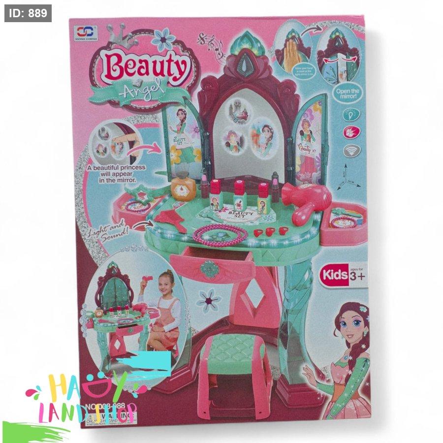 طقم تجميل للأطفال "Beauty Angel" بتصميم ساحر وألوان جذابة (وردي، تركواز، وأحمر)، يحتوي على مرآة سحرية تعمل بالاستشعار، حيث تظهر صورة أميرة جميلة عند وضع اليد أمام المستشعر.