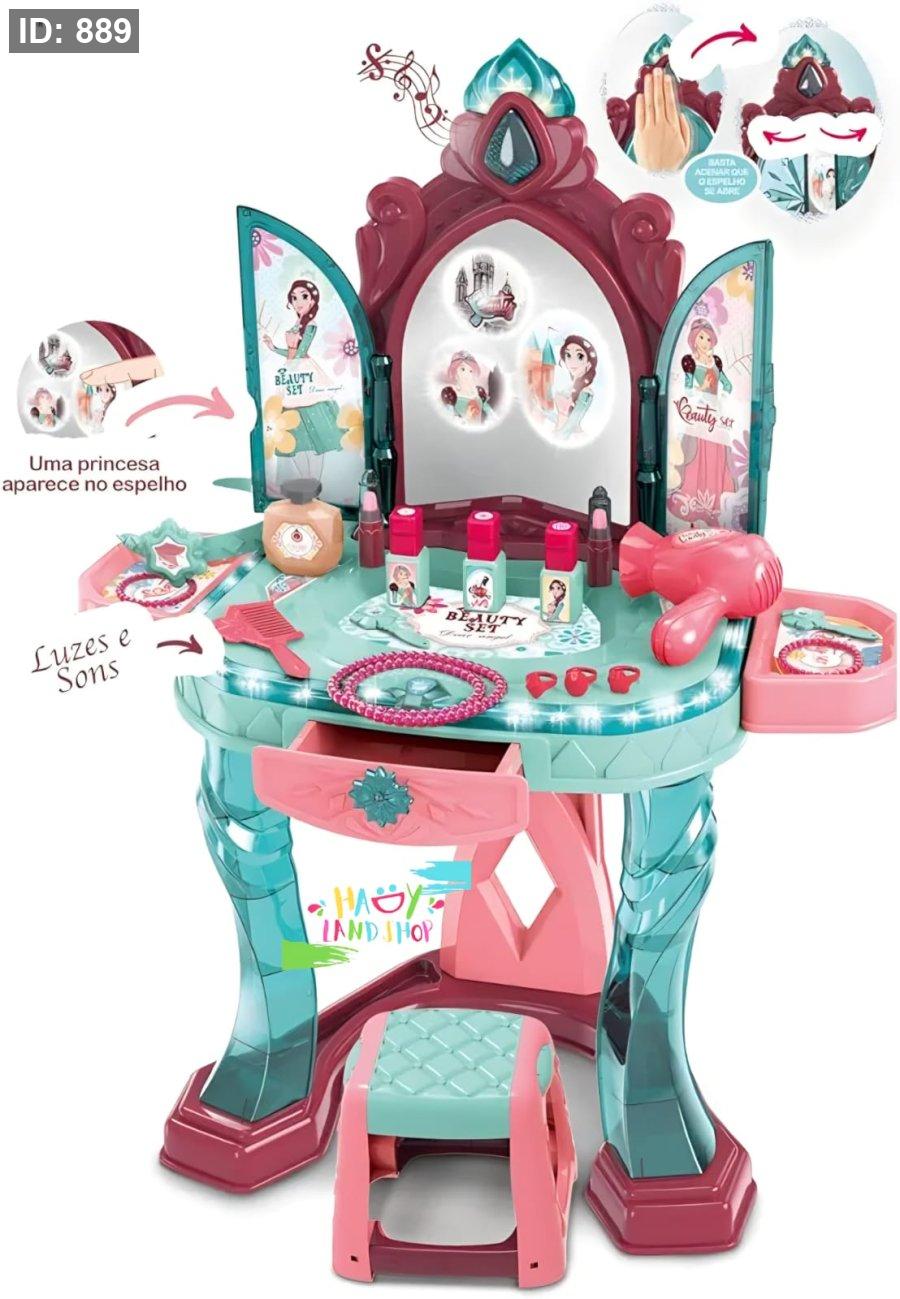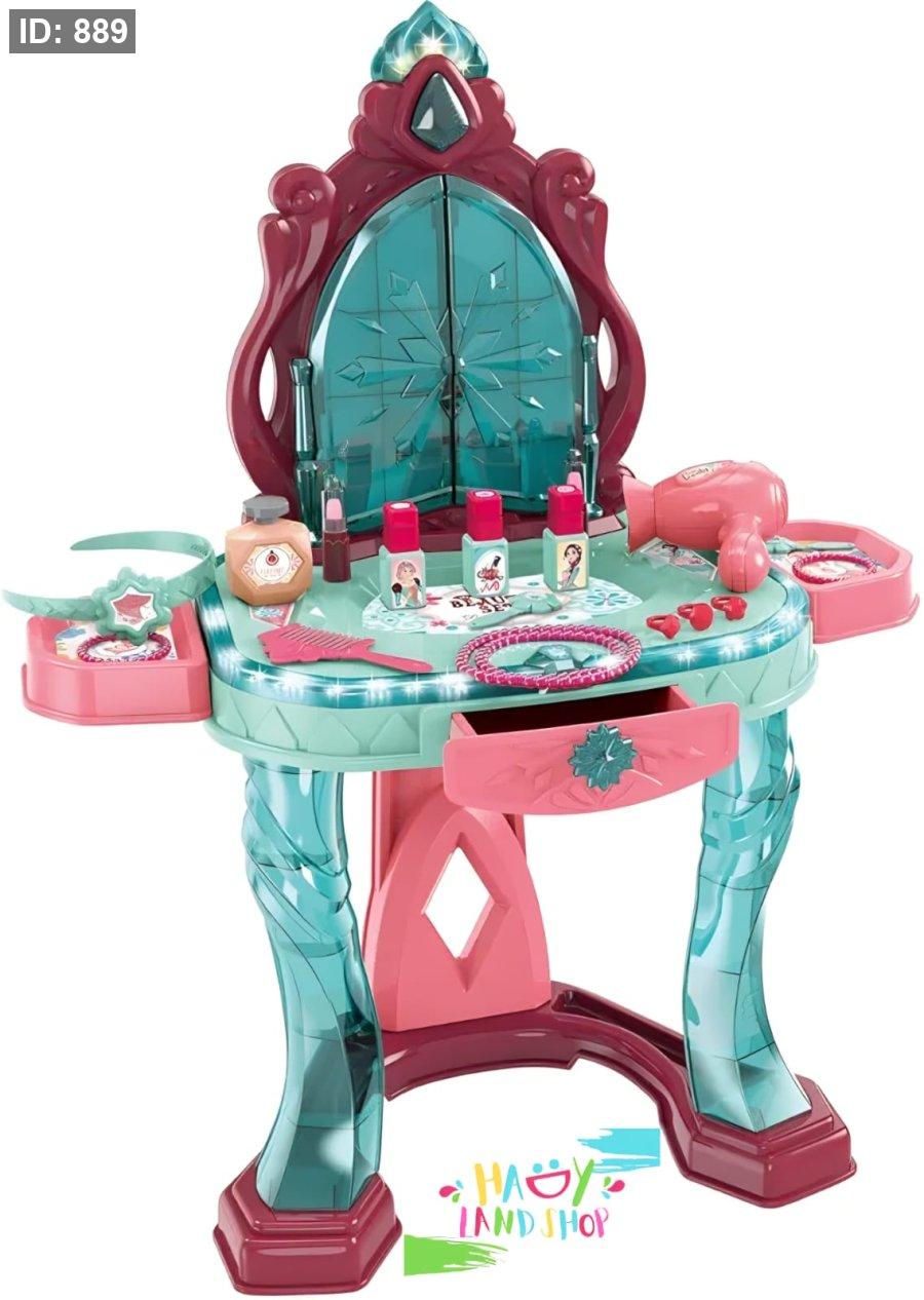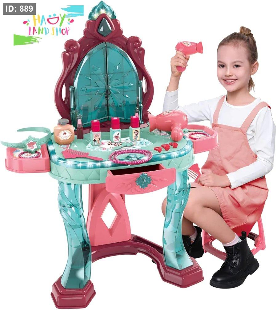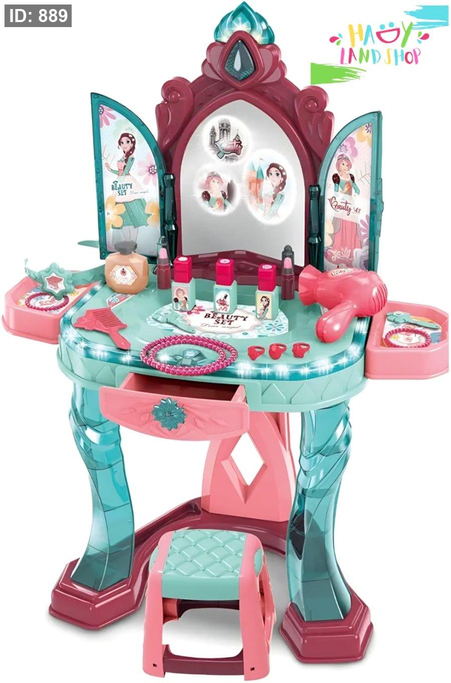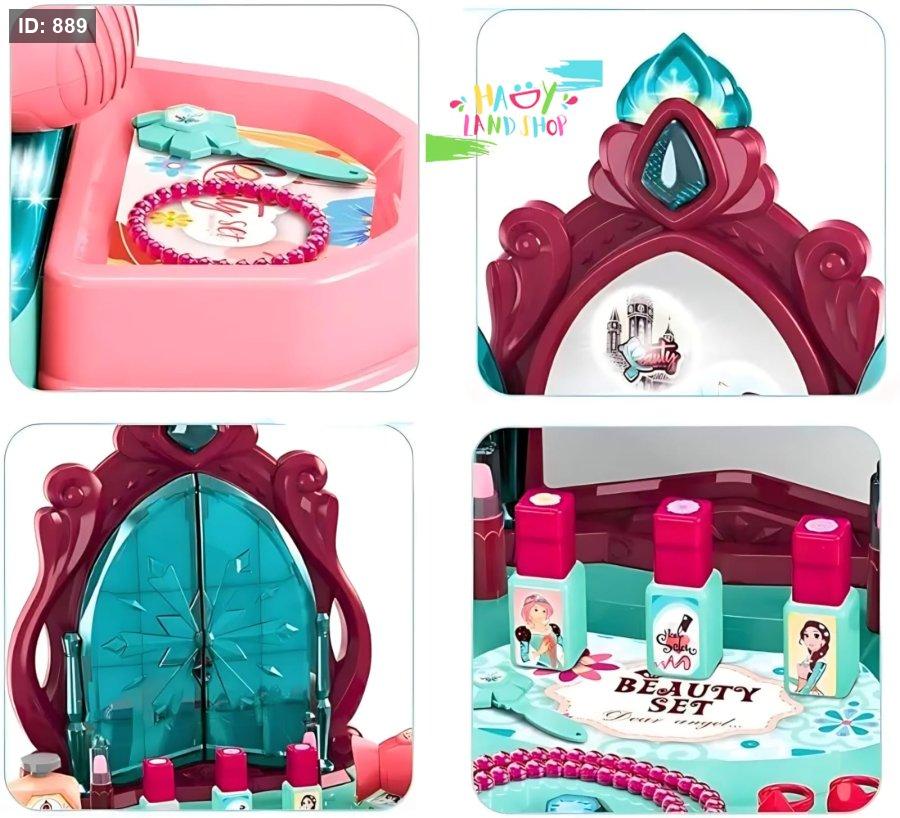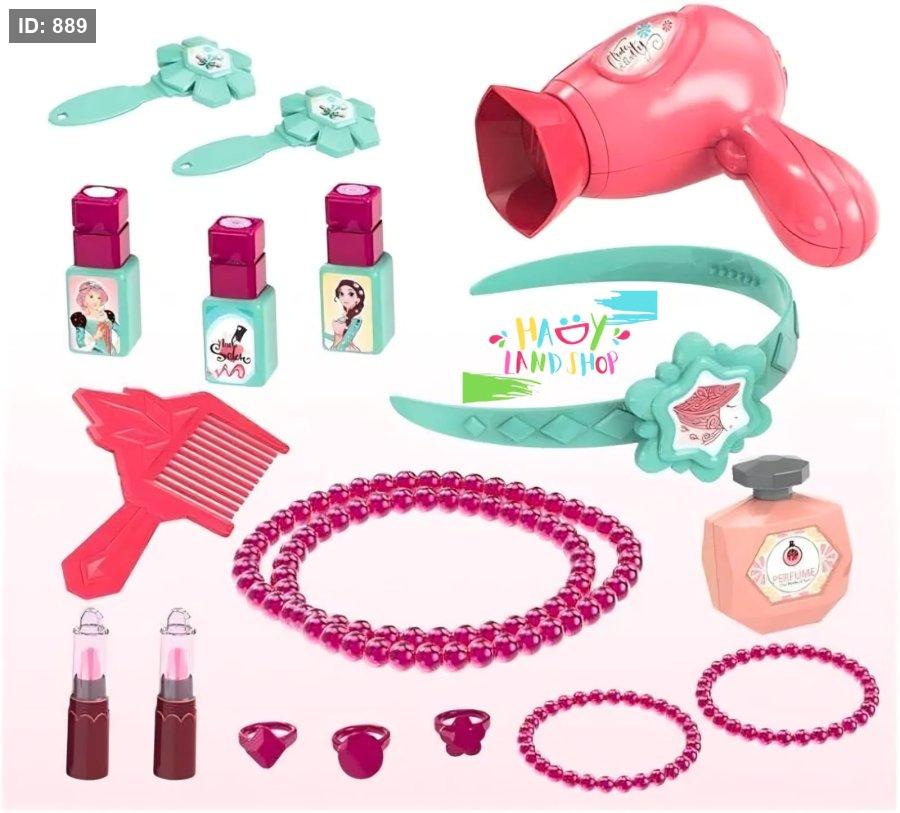 يشمل الطقم مجموعة من الإكسسوارات التجميلية مثل مجفف شعر، مشط، زجاجات تجميل، وكرسي صغير.