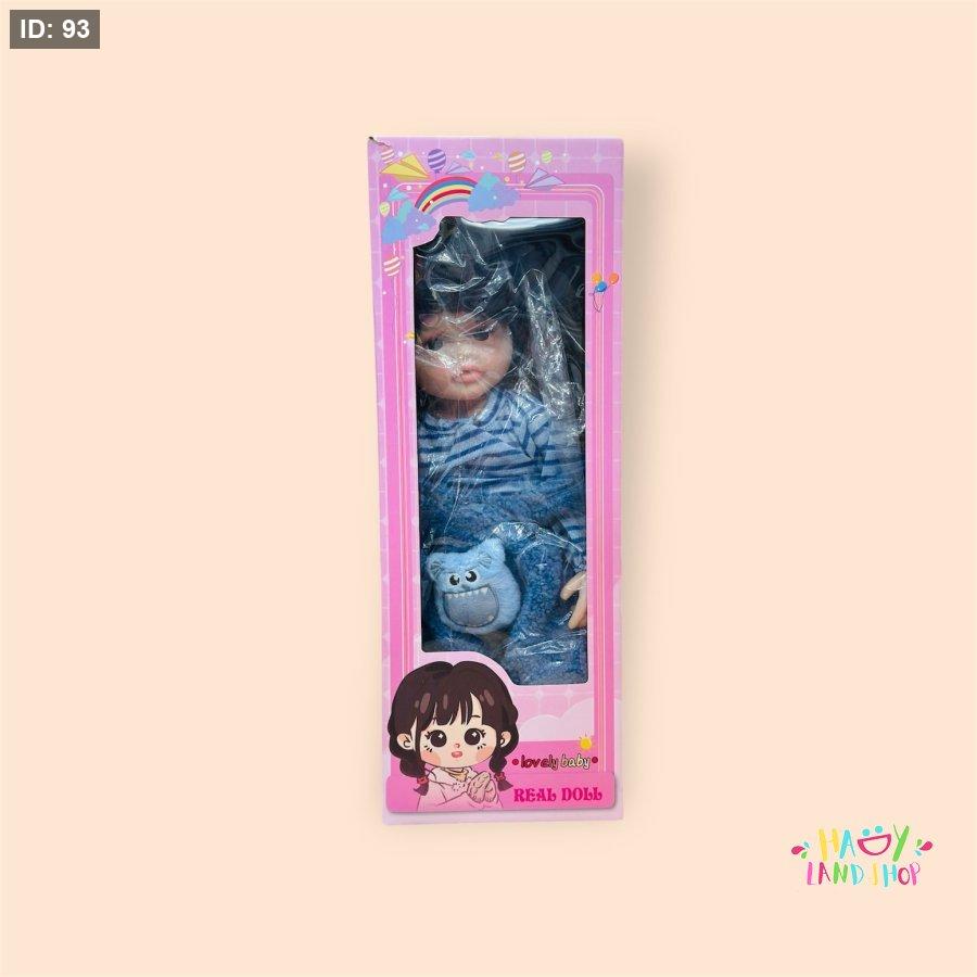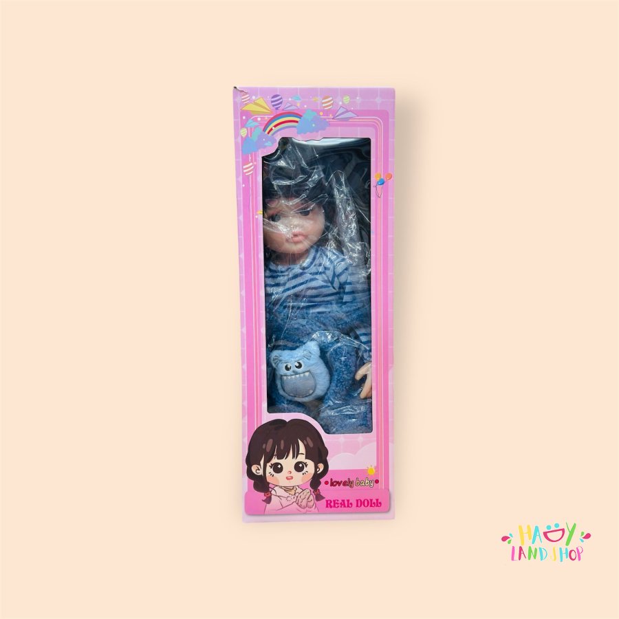 • ترتدي زيًا أزرق أنيق وتحمل لعبة قماشية لطيفة على شكل طفل صغير