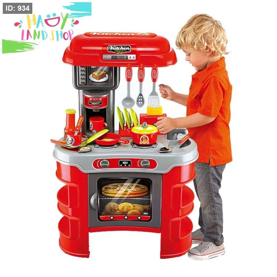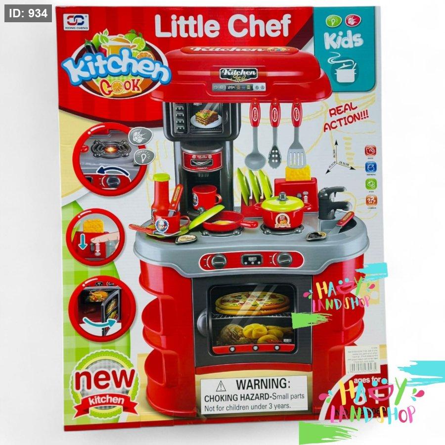 طقم مطبخ أطفال "Little Chef" من إصدار Kitchen Cook، يحتوي على 33 قطعة متنوعة تشمل أدوات الطهي، أواني، طعام بلاستيكي، فرن، موقد، مغسلة، وأزرار تفاعلية.