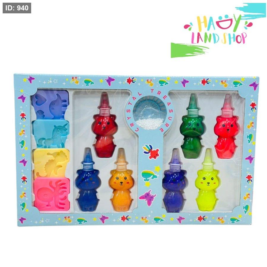 طقم "Crystal Treasure" الإبداعي للأطفال يحتوي على 7 زجاجات بشكل دب مليئة بألوان سائلة زاهية، بالإضافة إلى 4 قوالب سيليكون بأشكال حيوانات ممتعة مثل الدولفين، اليونيكورن، الأسد، والأخطبوط.