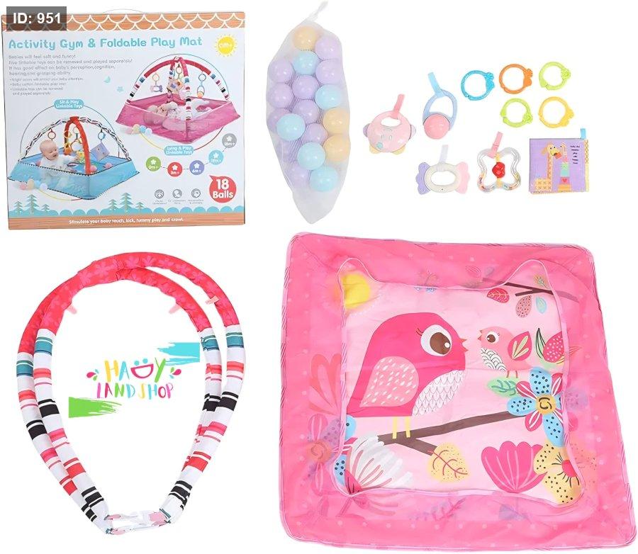 يحتوي على بساط قابل للطي برسومات طيور، قوس مبطّن لتعليق الألعاب، 18 كرة ملونة، مجموعة ألعاب تفاعلية، وكتاب قماشي مصوّر.