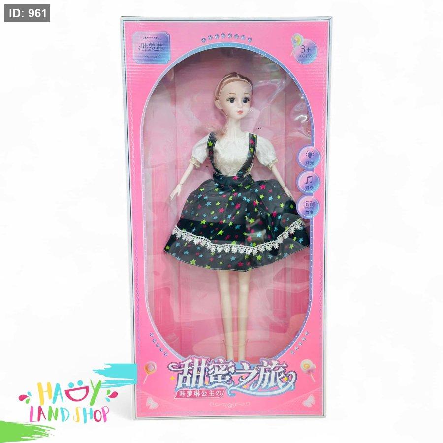 دُمية أنيقة تأتي في عبوة وردية جذابة مع نافذة شفافة لعرض التصميم. ترتدي بلوزة بيضاء بأكمام منتفخة وتنورة داكنة مزينة بنجوم ملونة وحواف دانتيل أنيقة.