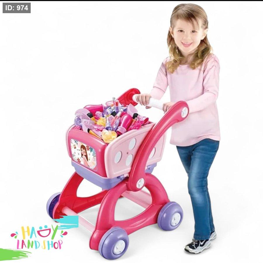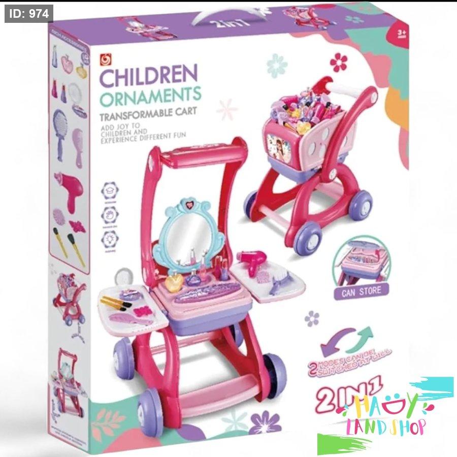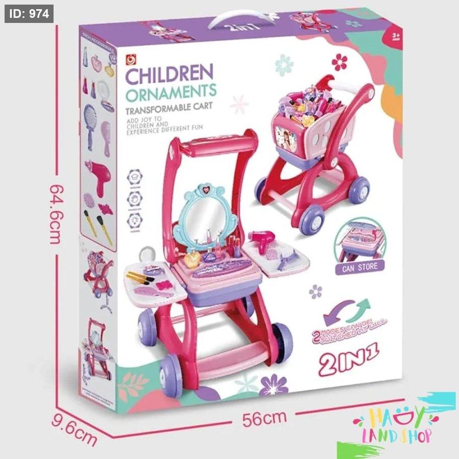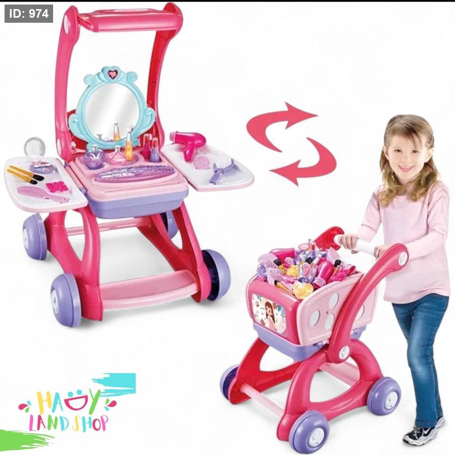 تتميز بتصميم 2 في 1 يمكن تحويله بسهولة بين عربة تسوق ومجموعة زينة متكاملة تشمل مرآة وإكسسوارات تجميل مثل مجفف شعر، فرشاة، مشط، وأدوات مكياج.