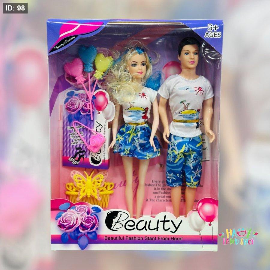• دمية ذكورية بشعر أسود وقميص بنفس التصميم مع شورت أزرق